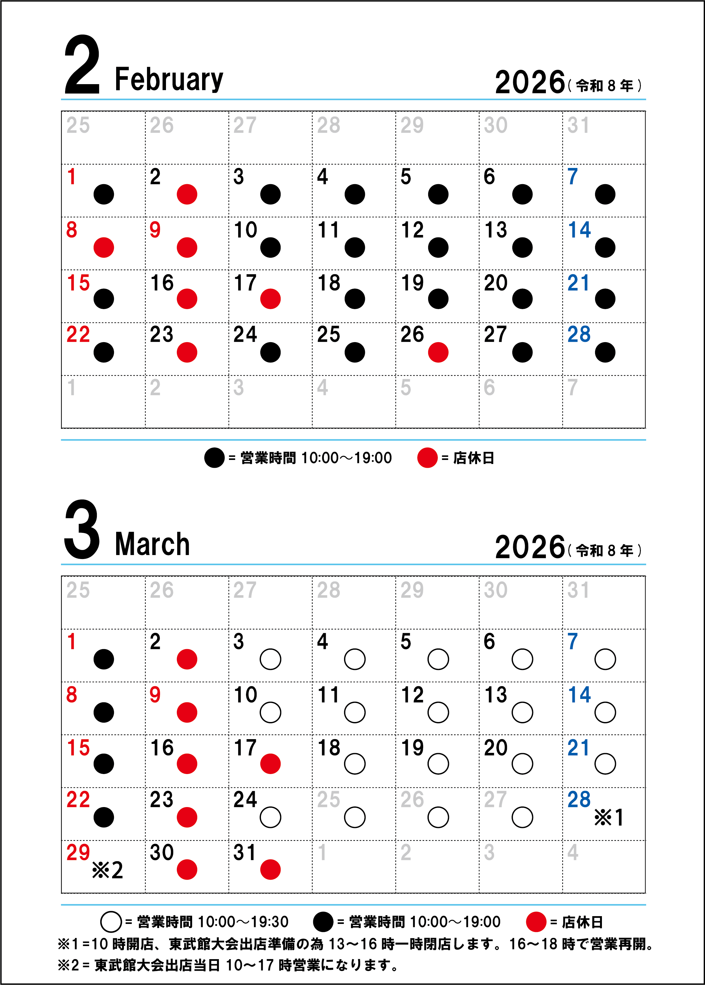 2月は8(日)と26(木)は臨時休業日となりますのでお気をつけください。3月は平日の営業時間が変更、10:00〜19:30となります。(日曜、祝日は10:00〜19:00のまま)また28、29日は東武館大会出店のためイレギュラーとなりますのでお気をつけください。