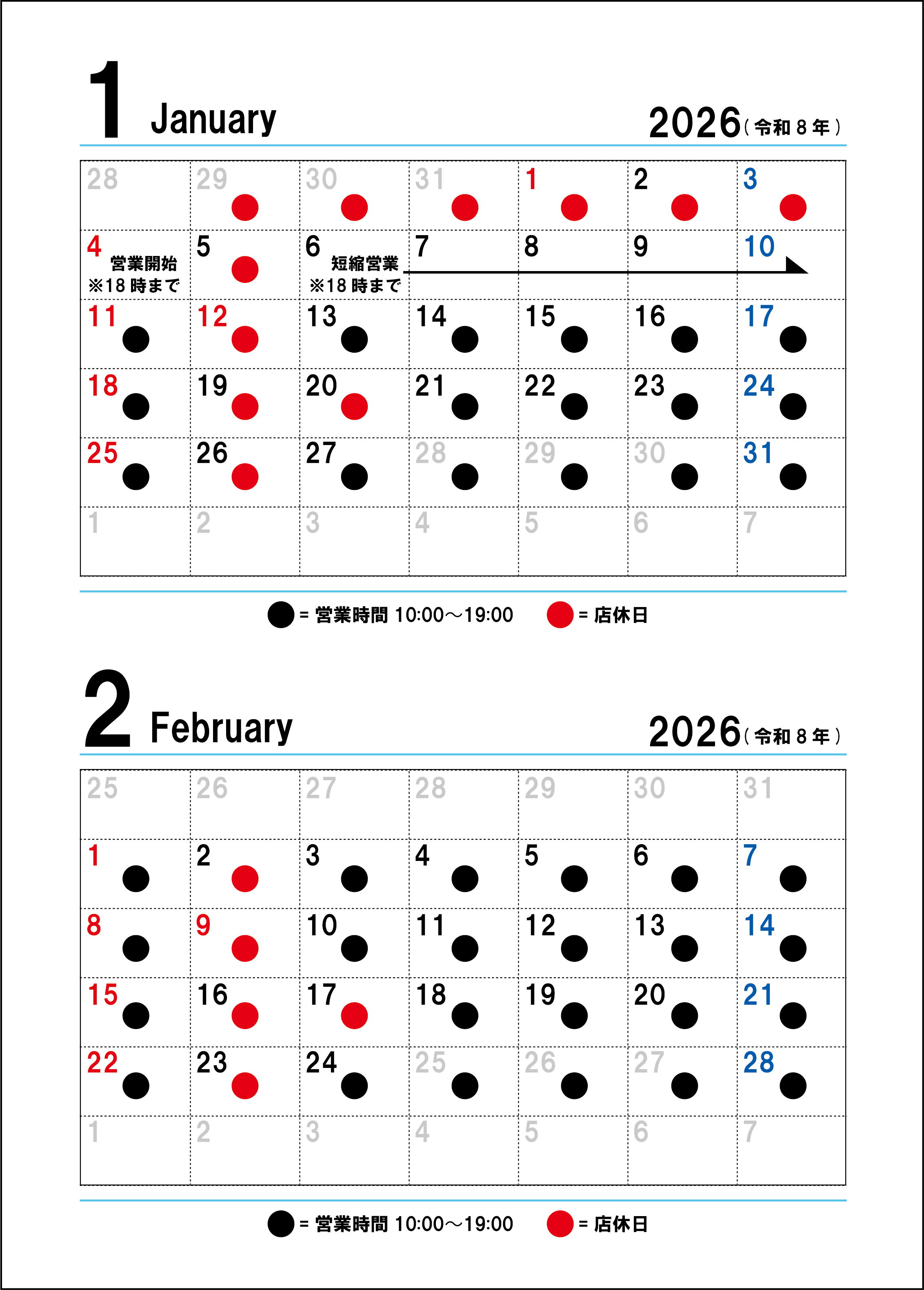 2025年は12/28が年内最終営業日となります。本年も多くのお客様にご来店いただき、心より感謝申し上げます。来る新しい年もお客様にご満足いただけますよう、スタッフ一同より一層のサービスを心掛けて参りますのでどうぞよろしくお願いいたします。年末年始の営業は下記カレンダーをご参照ください。期間中はご不便をおかけいたしますが、何卒ご了承くださいますようお願い申し上げます。2026年もたくさんのご来店をお待ちしております。2026年が剣道業界にとって明るい未来に繋がりますように。